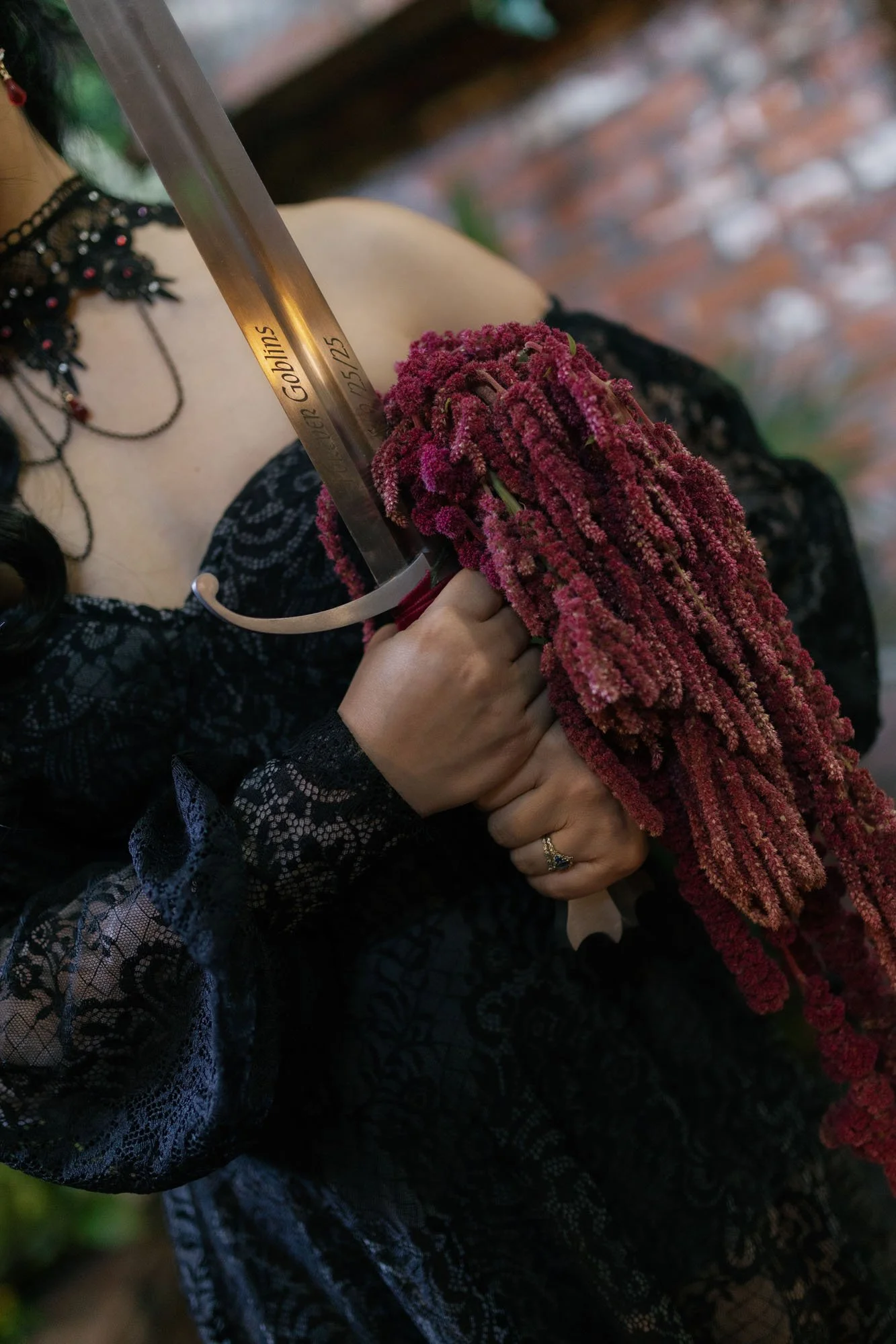 We would also like to shout out to our bride who took cues from Lydia in Beetlejuice and wore a red lace number to offset her dark plum bouquet.